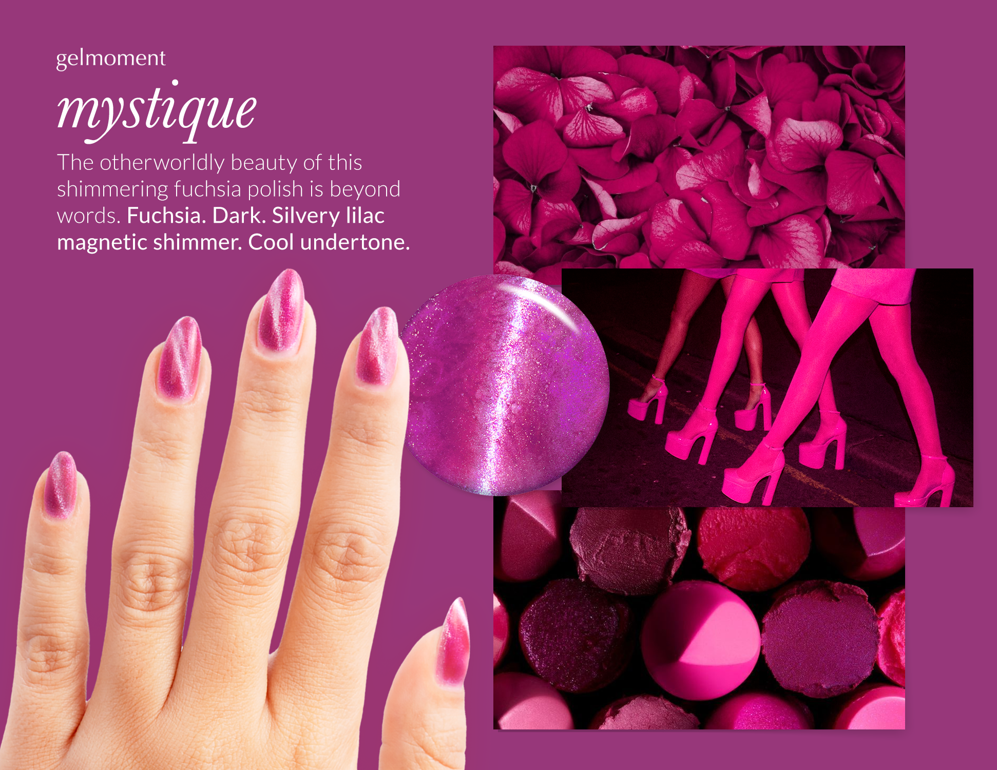 Fuchsia. Dark. Silvery lilac magnetic shimmer. Opaque. Cool undertone.